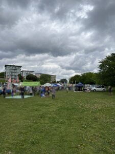 まず目に入るのは、青空(この日は曇りでしたが)を背景に泳ぐたくさんの鯉のぼり。風に吹かれて力強くはためく姿は迫力があり、思わず足を止めて見入ってしまいます。