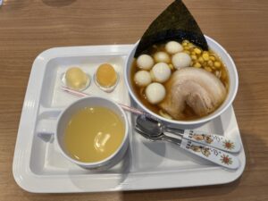 息子はお子様ラーメン税込380円。本来はSuicaで支払う予定でしたが、残念ながら忘れてしまい、現金払いに。セット内容はミニラーメン+ジュース+ゼリー2個という子どもに嬉しい構成。さらに、ゴールド会員の同伴特典でうずらの卵をプラスしました。